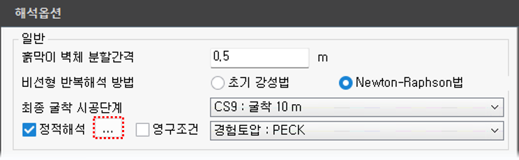 - 정적해석을 선택하게 되면 해당 시공단계에서의 굴착깊이, 활성화되어 있는 지보재 상태 그대로 별도의 정적해석을 수행하게 됩니다. 이전 단계까지 누적된 변위, 응력 등은 고려되지 않습니다.