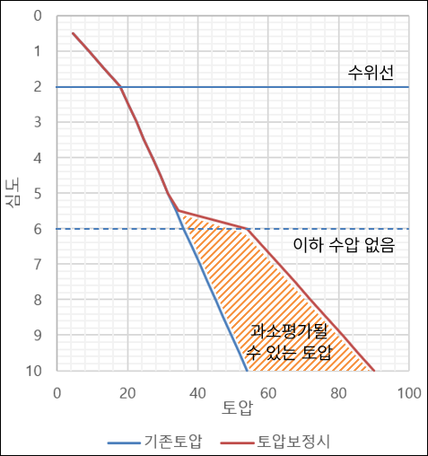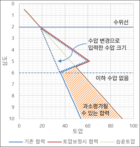 - 수압을 고려한 해석의 경우 설정한 지하수위 이하에서 토압은 수중단위중량으로 계산됩니다. 다만, 수압변경을 통해 사용자가 심도별로 입력한 수압을 적용하는 경우 (수중토압 + 수압)의 크기가 (습윤토압)보다 작아지는 경우가 발생하게 되어 흙막이벽에 작용하는 수평력(합력)이 과소평가하게 되는 문제가 생길 수 있습니다.