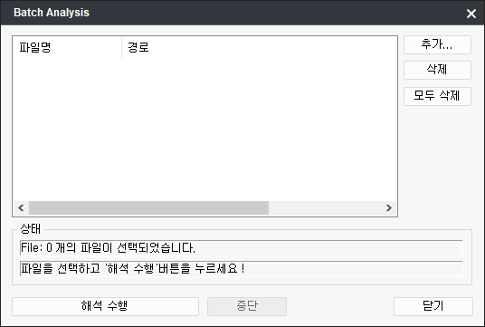버튼을 이용하여 해석할 파일을 지정합니다. 이때, 키보드의 Shift와Ctrl버튼을 이용하여 여러개의 파일을 선택할 수 있습니다.