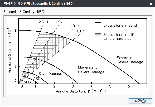 - 사용자가 선택한 허용각변위 또는 최대(부등)침하량과 선택한 절점의 변위를 비교 검토합니다. 하나의 기준에 대해서만 선택이 가능 합니다.