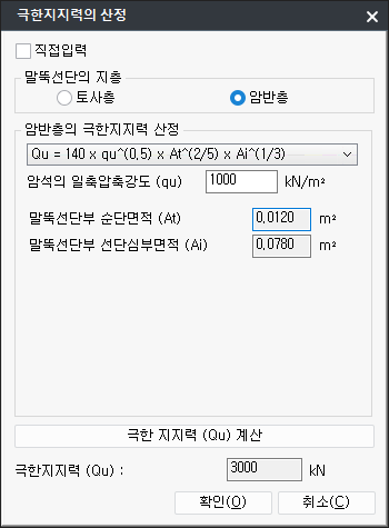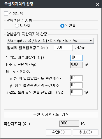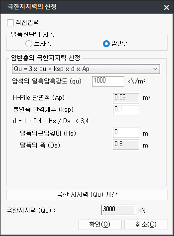 직접입력: 사용자가 직접 극한지지력을 입력합니다.