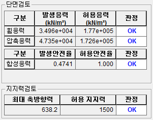 버튼을 클릭하면, 단면검토와 지지력검토에 대한 판정결과를 출력합니다.