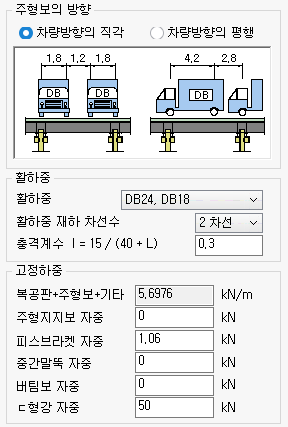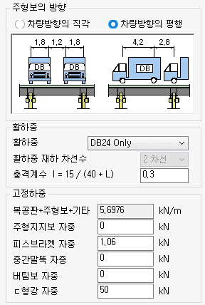 - 충격계수는 주형보의 계산지간에 따라 자동으로 계산되며, 사용자가 직접 입력할 수 있습니다.