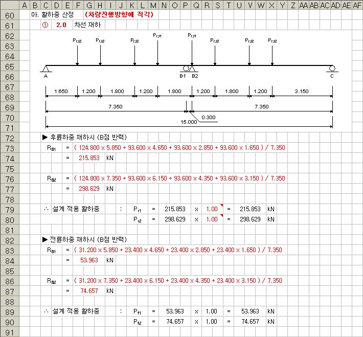 - 활하중이 여러차선에 동시에 재하되는 경우에 3차선은 0.9, 4차선이상은 0.75의 감소계수를 적용합니다.