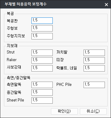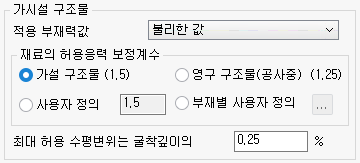 - 전체 부재에 대해 적용되며, 초기값은 0.9 입니다. 실무 가시설 설계에서는 0.9 또는 1.0을 주로 사용합니다.