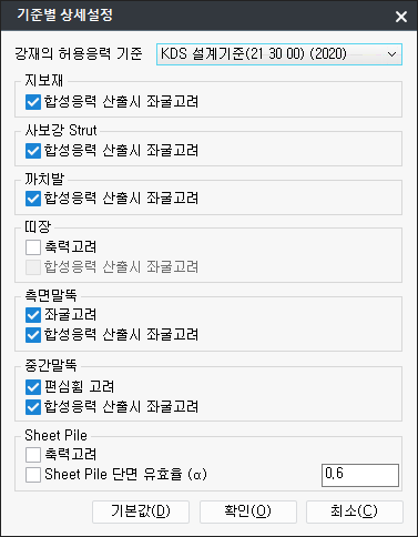 을 클릭하면, 지보재(Strut/Raker), 사보강 Strut, 까치발, 띠장, 측면말뚝, 중간말뚝, Sheet Pile에 대하여 각 기준별 설계검토를 위한 세부항목을 선택할 수 있습니다.