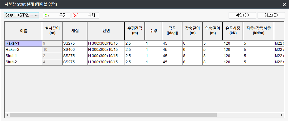 버튼을 통해 Spread Sheet 형식으로 설계데이터를 추가/삭제/수정할 수 있습니다. 동일한 특성의 사보강 strut이 많은 경우 편리하게 이용할 수 있습니다.