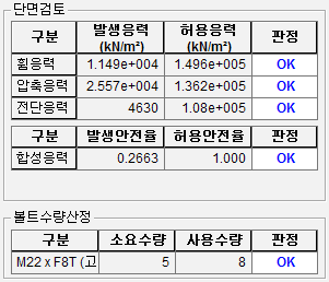 버튼을 클릭하면, 단면검토와 볼트수량에 대한 판정결과를 출력합니다.