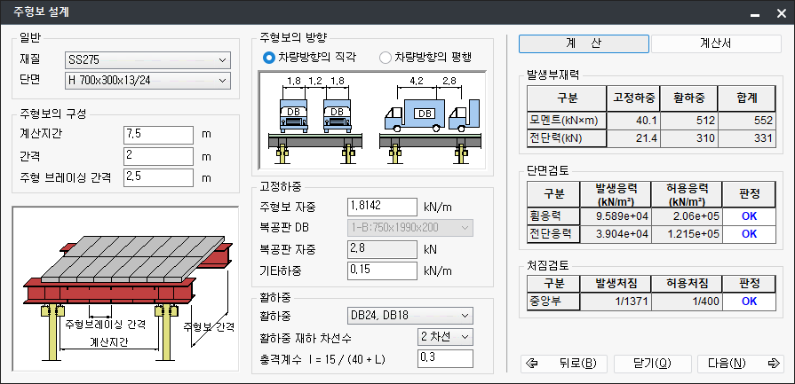 주형보 설계를 위한 주형보의 제원 및 활하중을 입력하고, 주형보의 단면, 처짐 등을 검토합니다. -