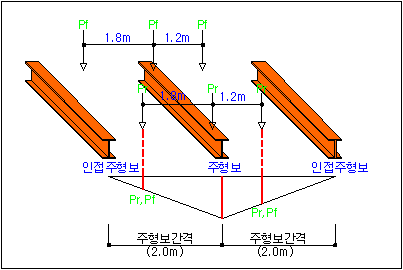 차량진행방향과 주형보의 방향이 평행한 경우에 인접보의 영향은 아래 그림과 같습니다.