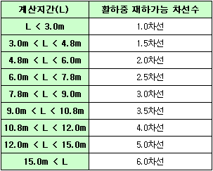 계산지간(L)에 따른 활하중 재하 가능 차선수입니다.