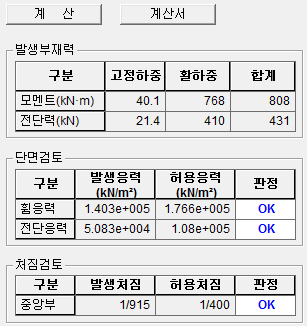 버튼을 클릭하면, 단면검토와 처짐검토에 대한 판정결과를 출력합니다.