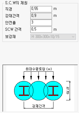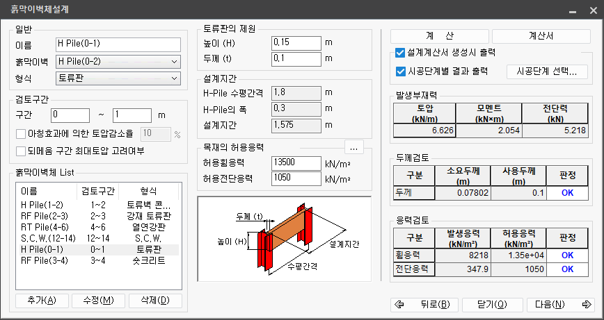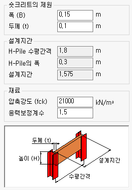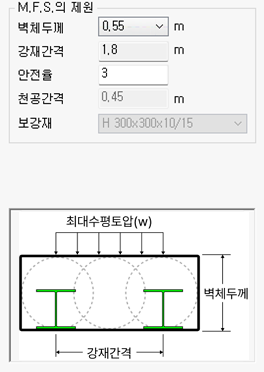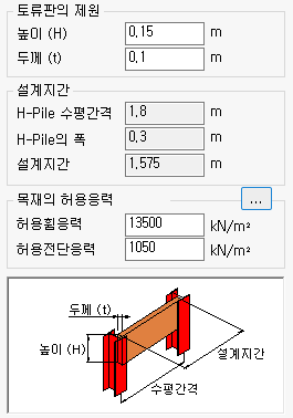 - 설계지간은 모델 > 흙막이벽(과 중간말뚝)의 정의에서 정의한 H Pile의 제원을 자동으로 계산합니다.