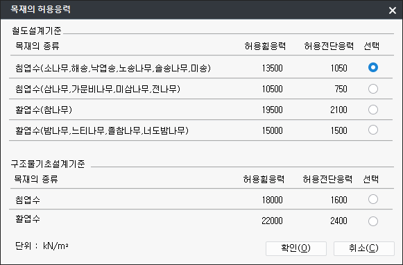 버튼을 클릭하면 목재의 종류에 따른 허용휨응력 및 허용전단응력을 나타낸 대화상이 나타나며 해당 종류의 목재를 선택하여 허용휨응력 및 허용전단응력을 결정합니다.