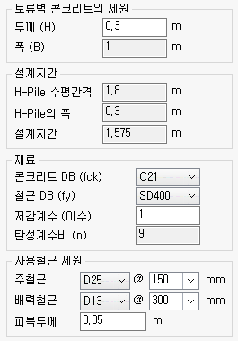 - 저감계수(이수) : 가설시 이수등에 의한 콘크리트 감소계수를 입력합니다. 일반적으로 0.85~1.00사이의 값을 사용하며 계산시 설계기준강도에 곱해서 허용응력값을 작게 고려하여 설계합니다.