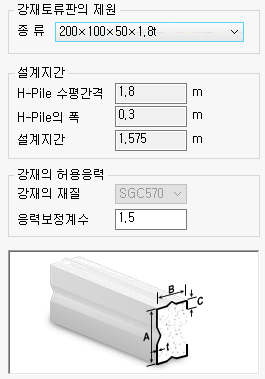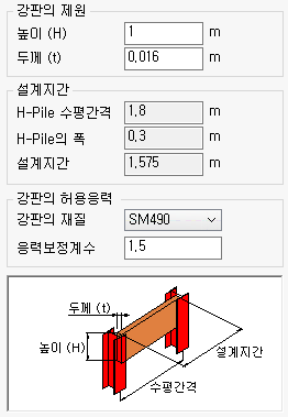 - 강재 토류판의 제원은 입력창의 그림과 같습니다.