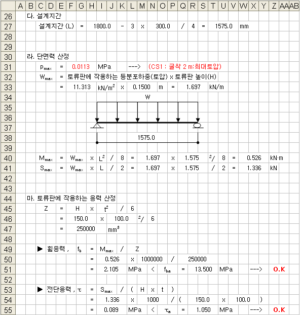 - 토류판 배면에 발생되는 토압은 아칭현상에 의해 강성이 상대적으로 큰 H형강 배면으로 집중됩니다. 따라서 이러한 아칭현상에 의해 토류판의 중앙에 작용하는 모멘트는 감소되는 경향이 나탄압니다. 또한, 두께가 110mm이상이 되면 인력에 의한 설치가 곤란하므로 토류판의 두께를 계산치보다 10%~15%정도 감소시키는 것이 바람직합니다. 그러나 연약지반에서는 아칭현상을 기대할 수 없으므로 계산치의 두께를 그대로 설치하여야 안전합니다.