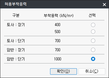 - 허용부착응력은 별도의 기준이 없으며, MIDAS GEOXD Analysis에서는「지하철 7호선 설계기준」과「구조물 기초설계기준」내용을 참조하였습니다.