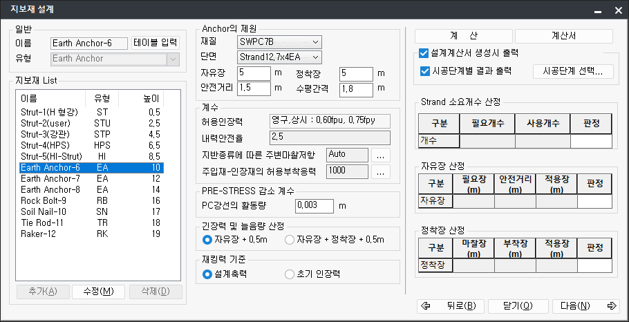 - 체크 옵션으로 설계계산서 출력시 해당 지보재의 단계별 결과 계산서 출력유무를 설정할 수 있으며,