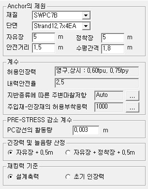 - 설계옵션에서 정의한 강선의 허용인장력 산정조건과 Anchor의 내력안전율이 표시됩니다.