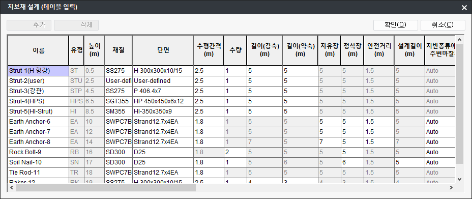 모델링 과정의 지보재의 정의에서 정의한 지보재에 대해서만 설계를 수행할 수 있으며, 지보재 설계 이전에 설계옵션이 정의되어야 합니다. -