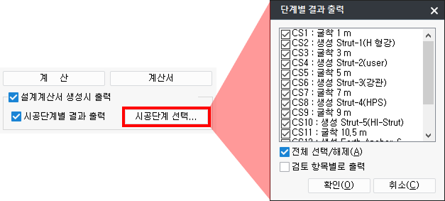 에서 출력할 시공단계를 선택하여 단계별 결과를 출력할 시공단계를 설정할 수 있습니다.