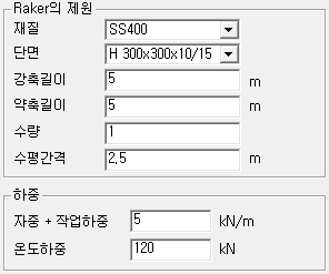 - Raker의 자중뿐만 아니라 철근을 달아매거나 발판등이 설치될 때와 같이 부가하중이 발생하였을 때 입력되며 5kN/m를 표준으로 사용합니다.