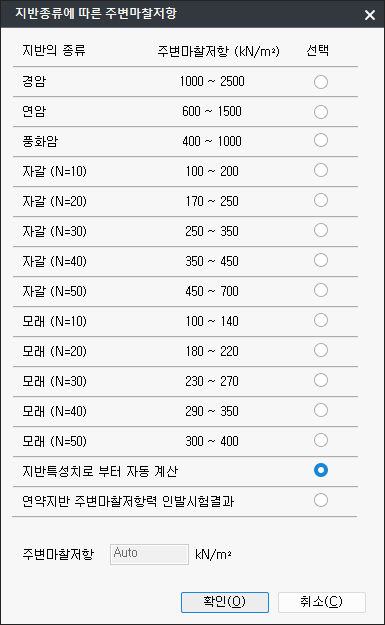 - '지반특성치로 부터 자동 계산'을 선택하면 각 지층의 주변마찰저항값과 접속길이를 고려하여 정착장을 계산합니다.