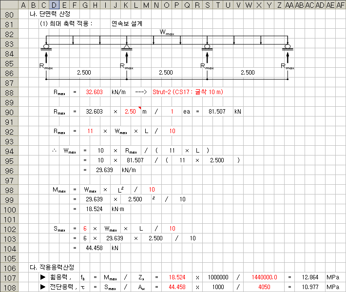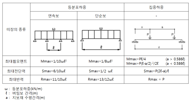 - 띠장 설계에 고려되는 하중 형태가 등분포하중이고, 단면력 산정 방법이 연속보 설계일 때