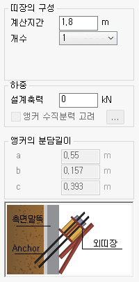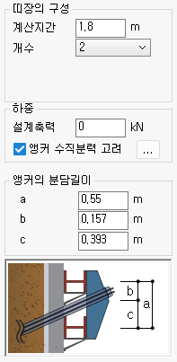 - Earth Anchor가 더블 띠장에 정착하고, 설계기준을 KDS 설계기준(21 30 00) (2022)로 설정한 경우 활성화됩니다.