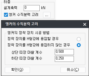 앵커의 정착 장치 시공 방법을 설정할 수 있습니다. - 정착 장치를 H형강에 용접하지 않는 경우 띠장 마찰 계수를 고려하여 수직방향 단면력을 산정합니다.