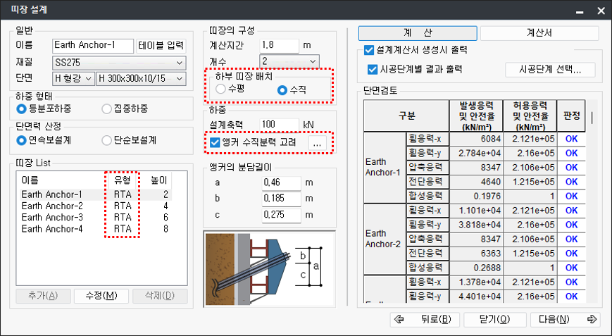 - R.T.A. 공법을 적용한 띠장 설계시 띠장에 작용하는 앵커의 수직분력을 고려하는 경우 연직방향으로 발생하는 큰 휨응력에 대응할 수 있도록 2열 띠장의 하부에 배치되는 띠장의 방향을 수직방향으로 배치하여 설계 계산을 수행할 수 있습니다.