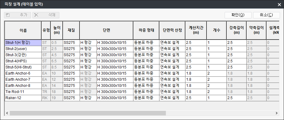 지보재의 정의에서 Strut, Earth Anchor, Tie Rod, Raker를 설치한 경우에 활성화 되며, 모델링 과정에서 띠장에 대한 별도의 입력은 받지 않습니다. 띠장설계를 위해서는 설계옵션이 설정되어 있어야 합니다. -