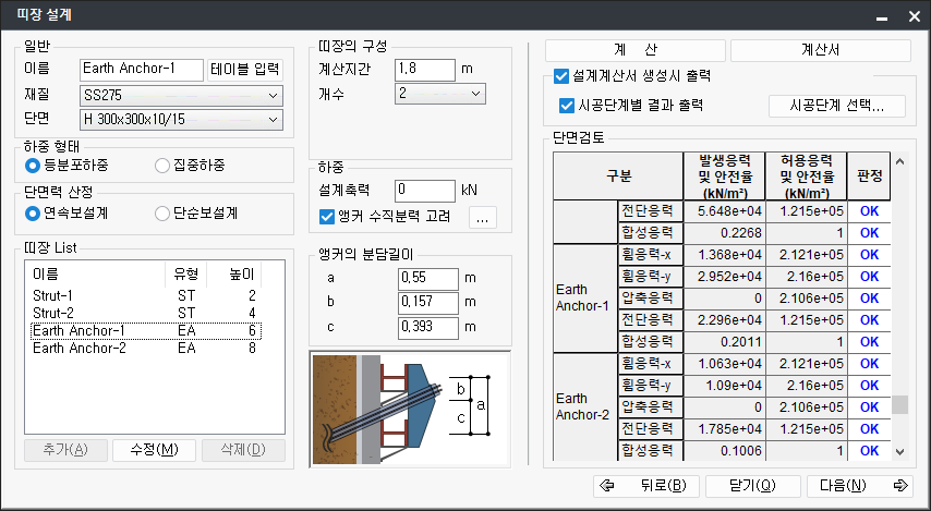 체크 옵션으로 설계계산서 출력시 해당 지보재의 단계별 결과 계산서 출력유무를 설정할 수 있으며,