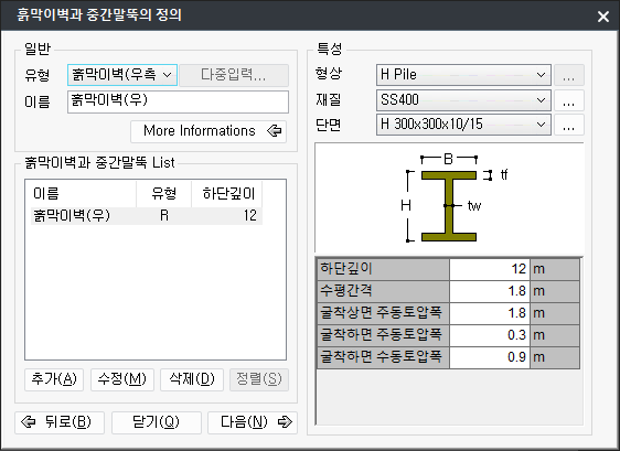 - HSpaci, HWide : H-Pile의 수평간격, 폭