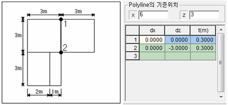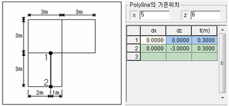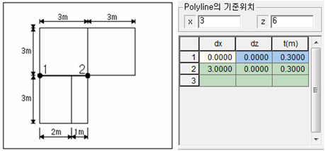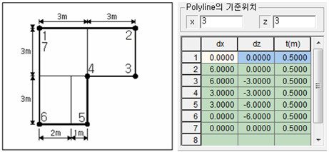 - 첫 번째 Polyline의 기준위치는 흙막이벽(우)으로부터 (3, 3)에 위치합니다.