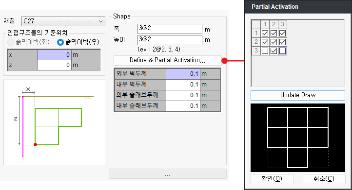 - 격자형 구조물을 구성한 후에, 각 cell들을 Partial Activation을 이용하여 활성화 또는 비활성화하여 지하구조물을 생성합니다.