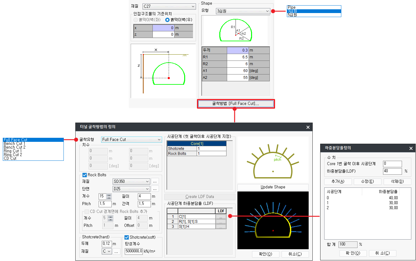 굴착유형으로 Full Face Cut, Bench Cut, Ring Cut, CD Cut 단면을 선택하여 터널구조물의 정확한 모델링을 할 수 있습니다.