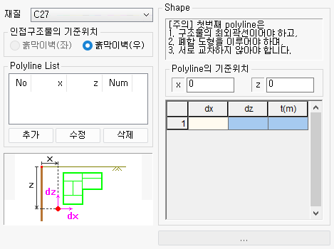 선택한 구조물 유형에 따라 입력창이 변경됩니다. -