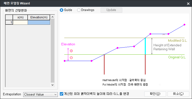 - 입력된 배면의 선형변화 좌표들로부터 수정되는 흙막이벽의 높이를 계산해서 최대 높이의 흙막이벽 상단부를 모델의 G.L.로 변경합니다.