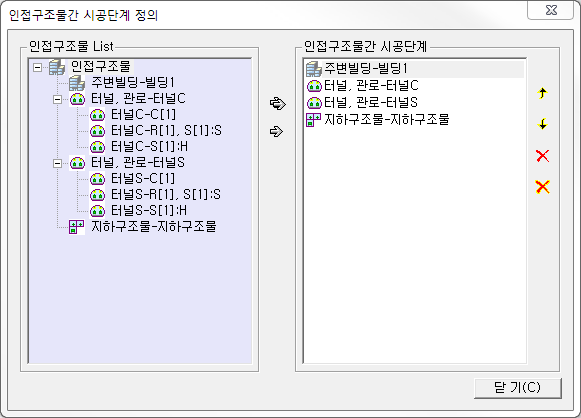 - 굴착지반 주변 인접구조물이 2개 이상 포함된 경우 인접구조물간의 시공단계 순서를 정의합니다.