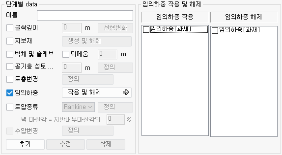 단계별 data의 토압종류는 해석종류가 "탄소성보법"을 포함한 경우에만 활성화 됩니다. 변경된 수압을 직접 입력하는 "수압변경" 옵션은 해석종류가 "탄소성보법"을 포함한 경우에만 활성화 됩니다. -