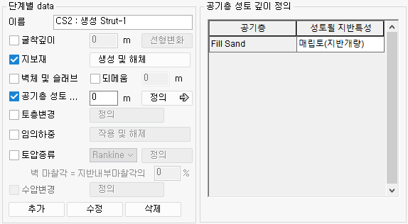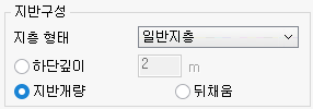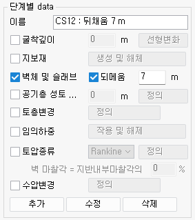 (※ 단, "지반의 정의 > 뒤채움" 타입으로 정의된 지반이 존재해야 뒤채움 지반이 고려됩니다.) - 되메움 : 모델 > 지반의 정의 > 지층형태 > 되메움으로 정의된 지반이 있으면 활성화 됩니다.