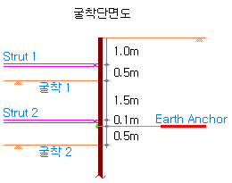 - 시공단계 4: Strut 2(3m), Earth Anchor(3.1m) 설치