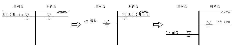 수위차 중간의 경우 배면수위로부터 배면측/굴착측 수위의 중간위치까지 수압이 증가하다가 다시 감소하여 굴착측 수위에서는 수압이 '0'이 됩니다.
