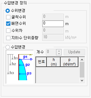 - 기본 전제 : 배면측 수위와 흙막이벽체 하단에서의 수압은 "0"으로 입력됩니다.