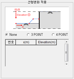 4 POINT : 굴착면이 4점으로 지정되는 경우 거리별 지반의 굴착깊이(+)를 입력합니다. raker에서 일정간격이 떨어지고, 소단이 있는 경우 사용됩니다. 0 ≤ x ≤ 굴착폭(+) 이며, 0 ≤ Elevation ≤ 최대굴착깊이(+)의 범위를 갖습니다.