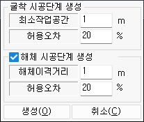 - 해체 시공단계 자동생성의 경우 뒤채움 또는 되메움이 모델링 되어있는 상태에서 활성화되며, 체크 여부에 따라서 해체 단계를 자동으로 생성하거나, 생성하지 않을 수 있습니다.