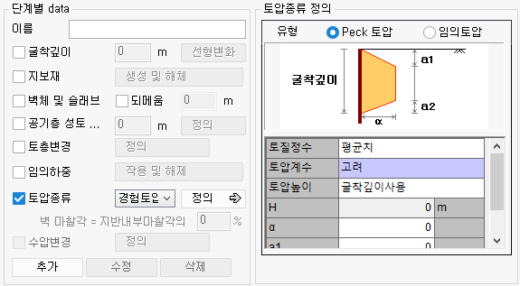 - Peck 토압 : "굴착깊이사용" 옵션을 선택하면 해당 시공단계의 굴착깊이가 반영됩니다. 직접지정을 통해 사용자가 임의 값을 지정할 수 있습니다.