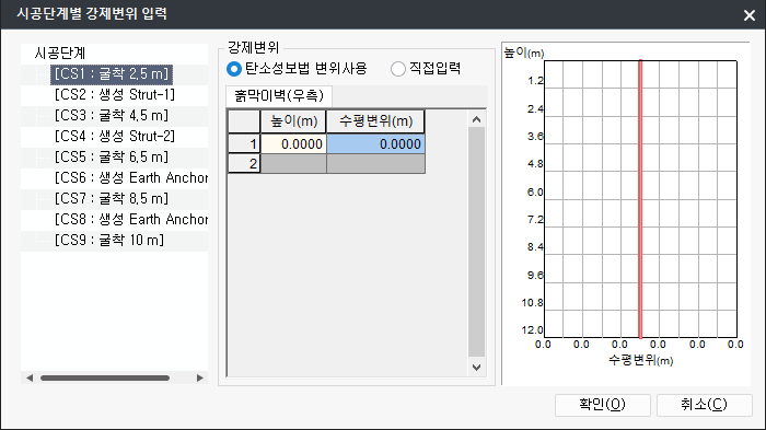 해당 시공단계에서 지반의 굴착이 필요할 경우에 입력합니다. 최상단으로부터 지반의 굴착깊이(+)를 입력합니다.